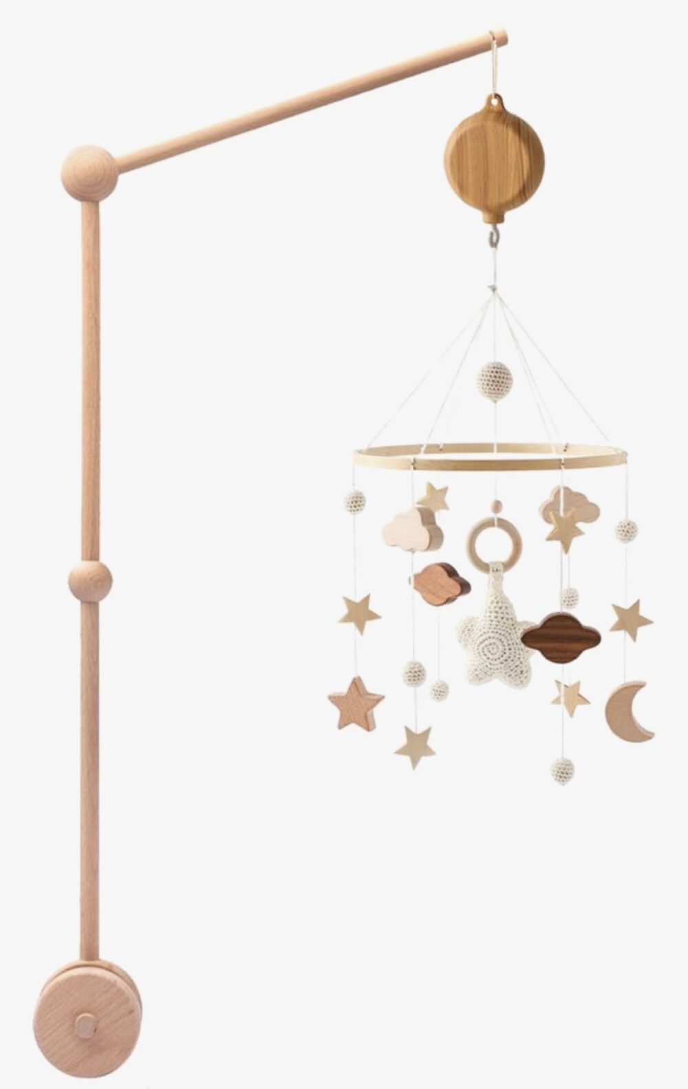 Met deze mooie babymobiel boven het babybedje zal je kleintje snel ontspannen. De sterren en wolkjes nemen je kindje mee naar dromenland voor een vrolijke en rustgevende nacht. De muziekmobiel speelt liedjes af en kan de mobiel laten draaien (kan ook uitgezet worden).