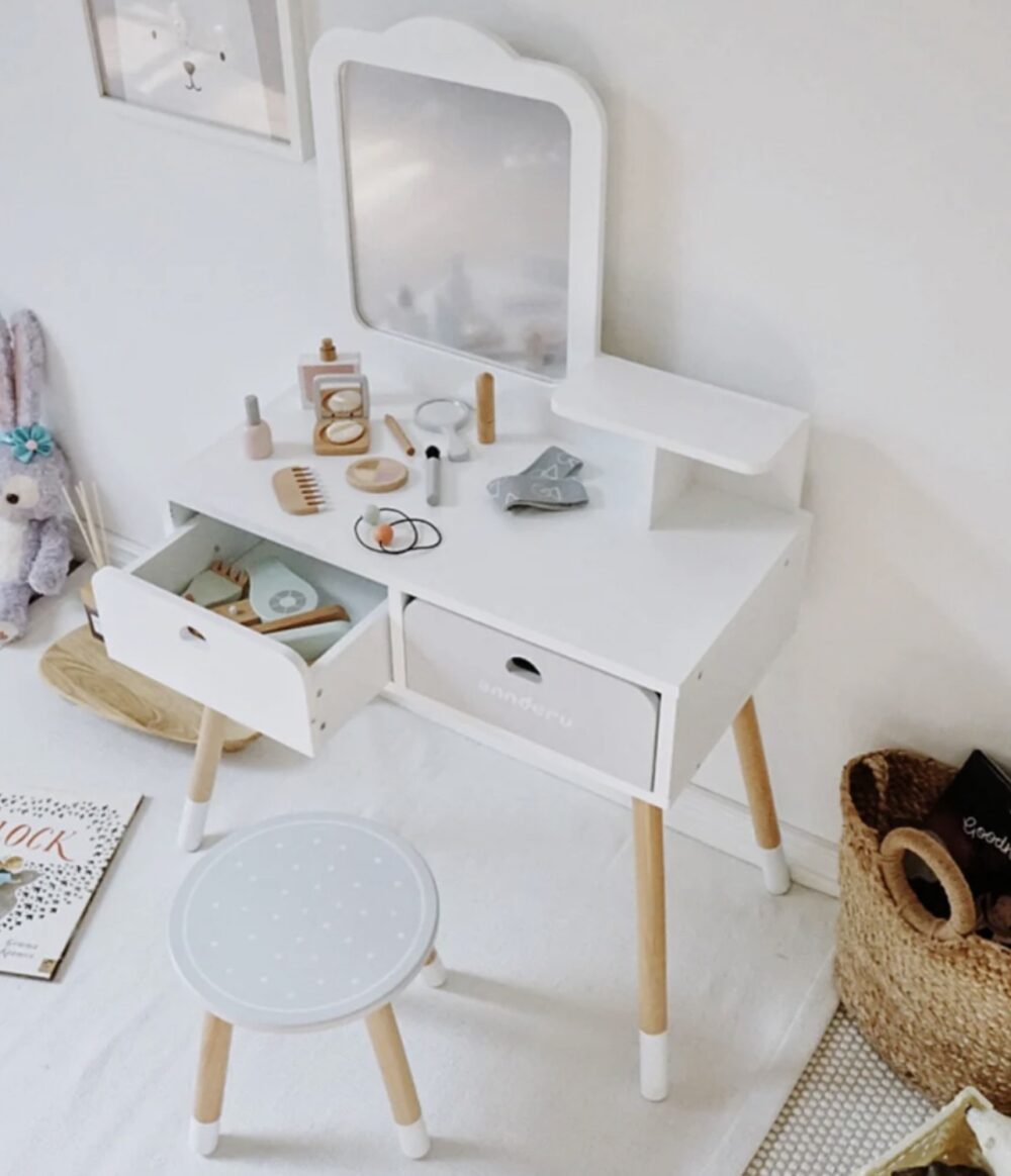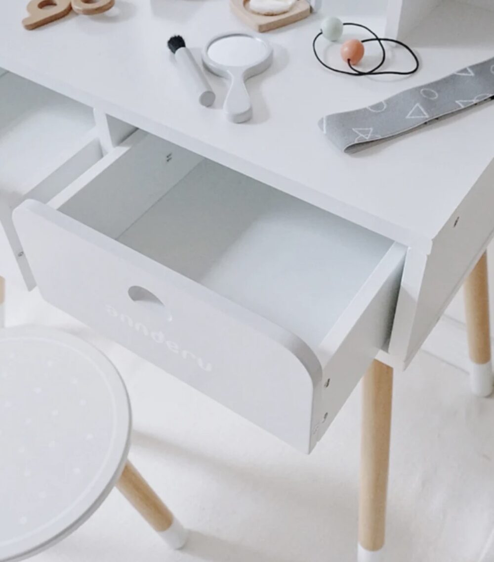 Naast zijn functionele waarde voegt de kaptafel ook een vleugje charme toe aan de speelkamer of kinderkamer. De witte afwerking en het stijlvolle ontwerp passen goed bij diverse interieurstijlen en maken de kamer van uw kind compleet.