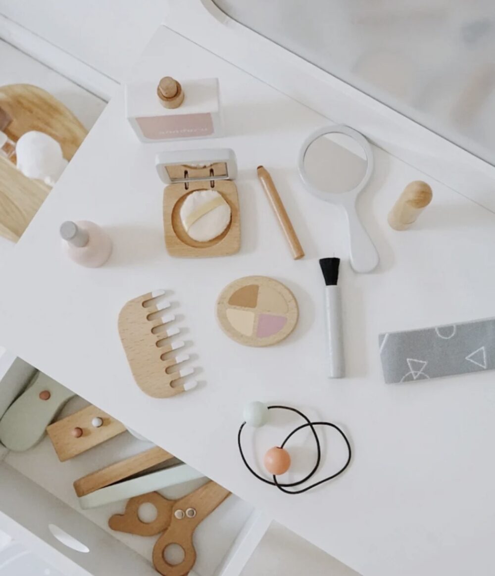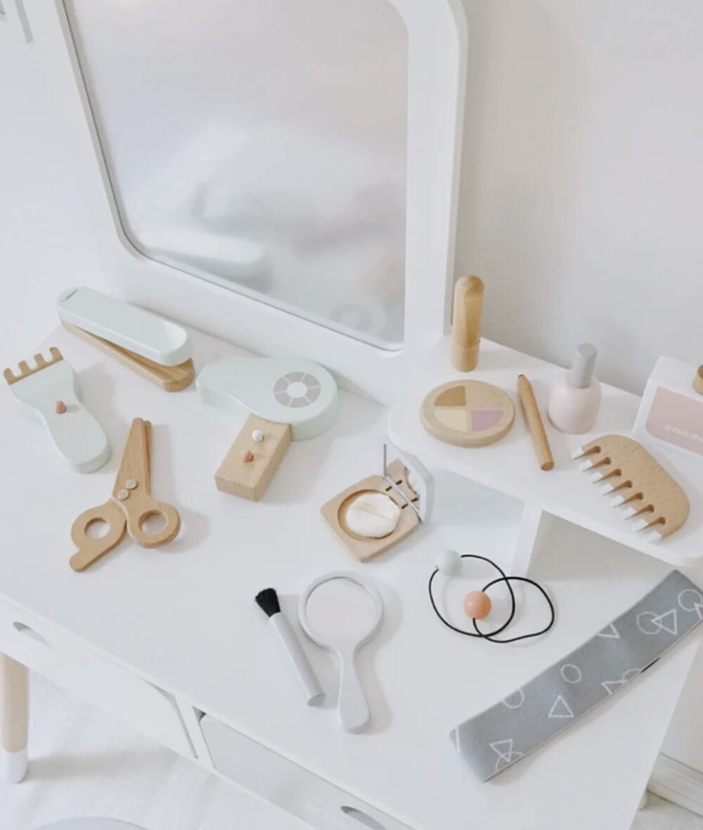 De kaptafel stimuleert de creativiteit van kinderen. Ze kunnen doen alsof ze zich voorbereiden voor een grote gebeurtenis, make-up aanbrengen of hun haar kammen. Dit speelgoed helpt kinderen om hun verbeelding en fijne motoriek te ontwikkelen.