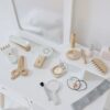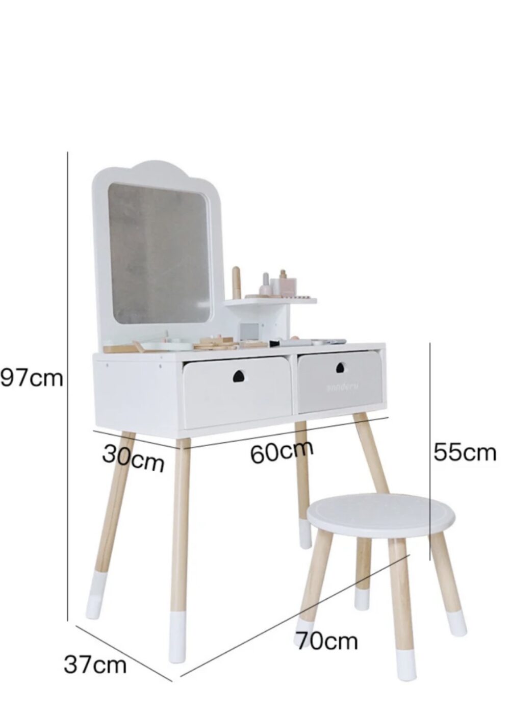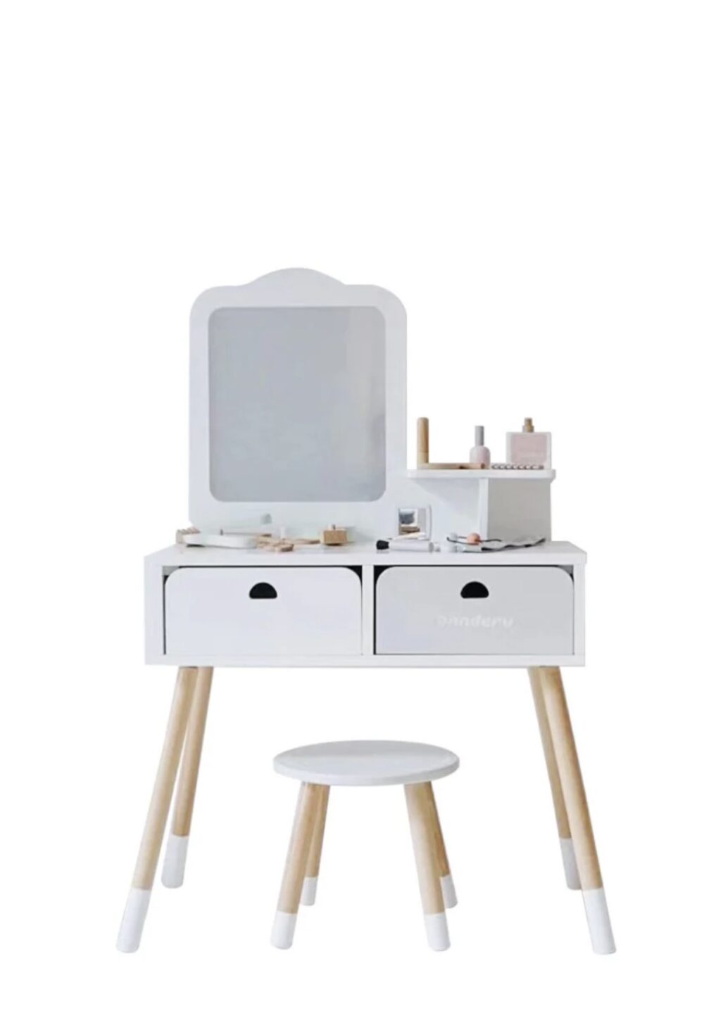 Deze kaptafelset is gemaakt van hoogwaardig hout, wat zorgt voor duurzaamheid en een elegante uitstraling. Het kindvriendelijke ontwerp met afgeronde hoeken en stevige constructie garandeert een veilige speelomgeving voor uw kind.