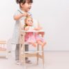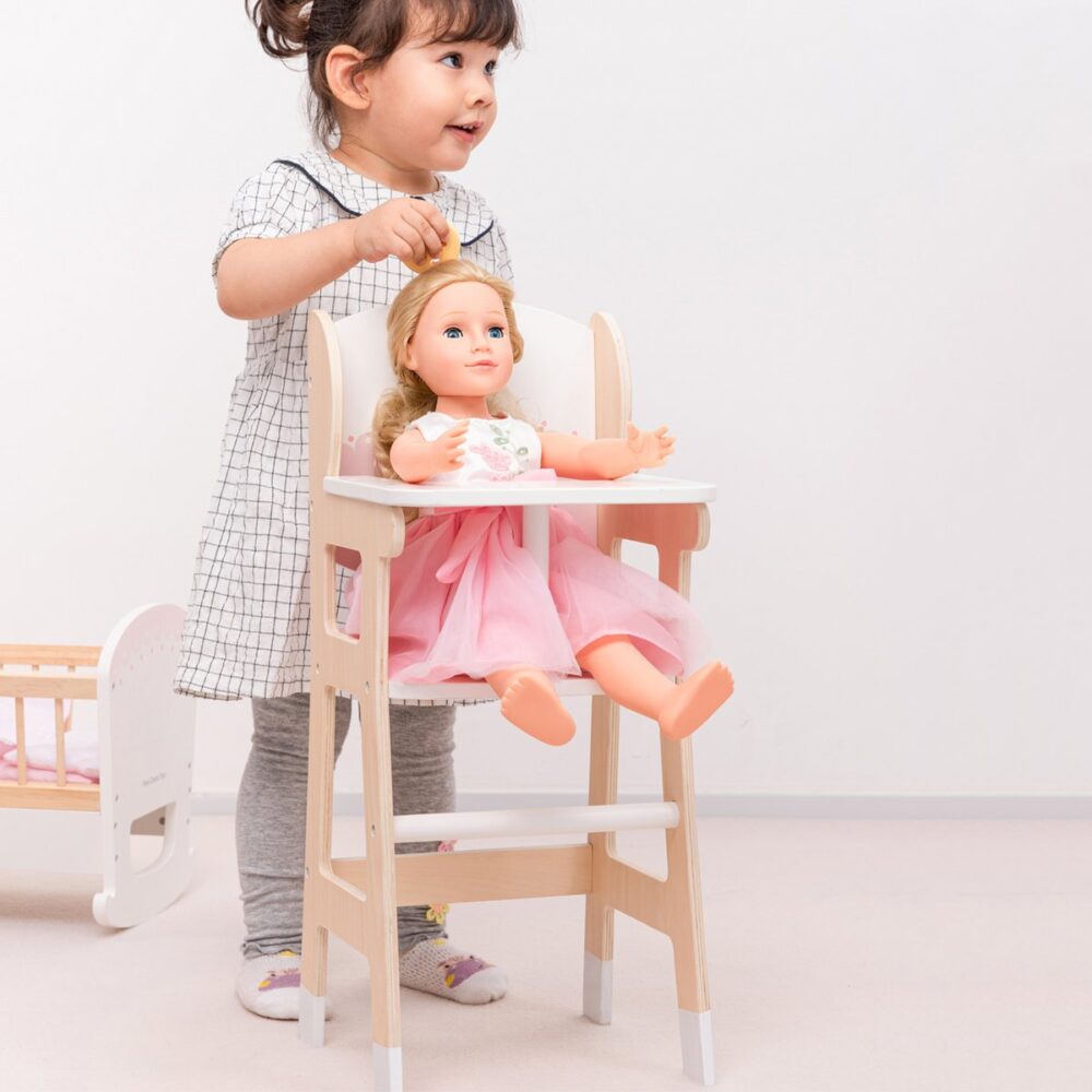 De poppenstoel heeft een bijpassend kussen om je pop of teddybeer comfortabel en glimlachend te houden terwijl je kleintje het eten klaarmaakt. Compleet met zitsteun, voetensteun en voerbak. Ideaal voor poppen en knuffels tot 43 cm.