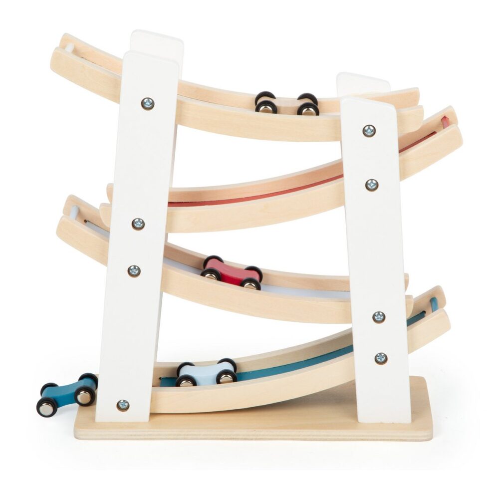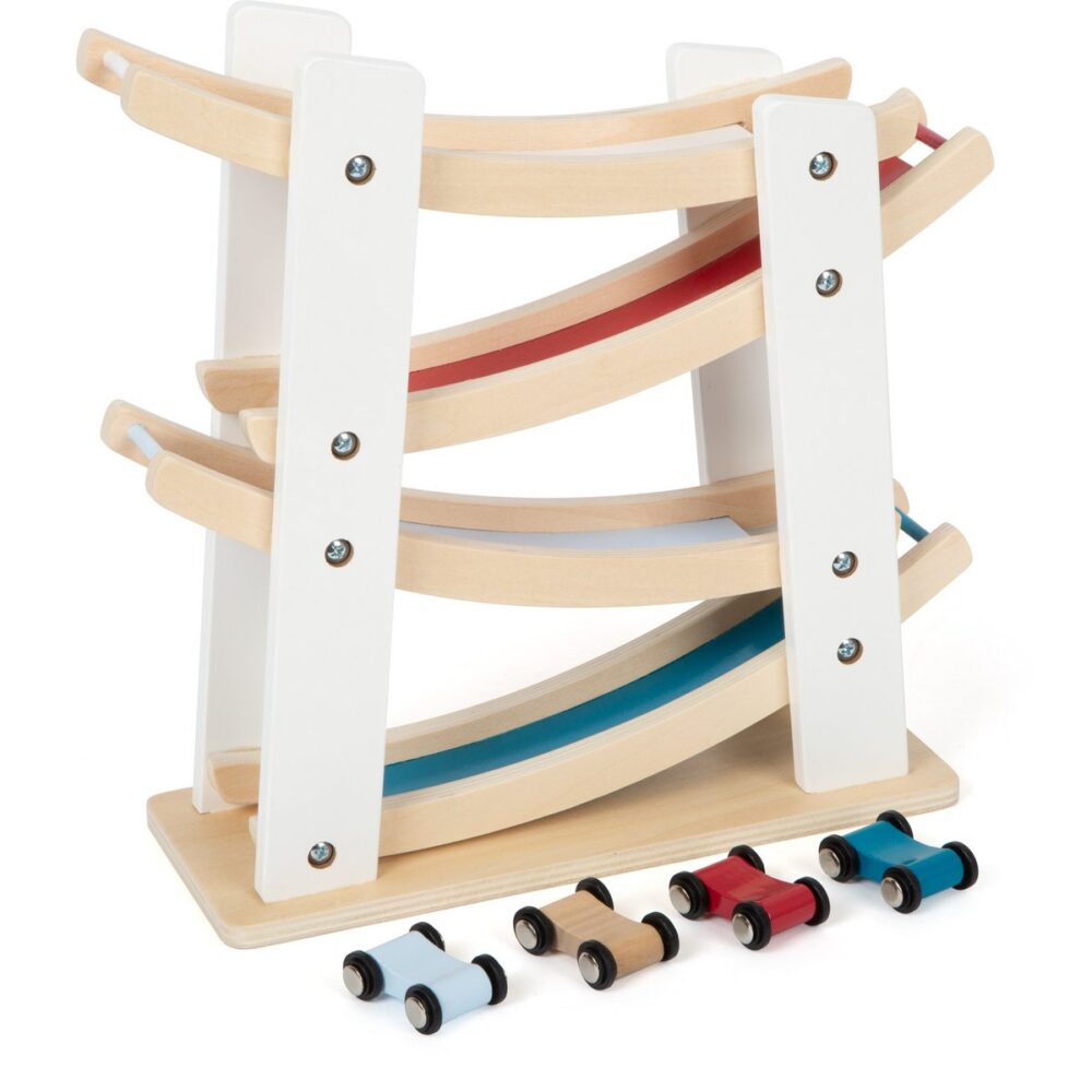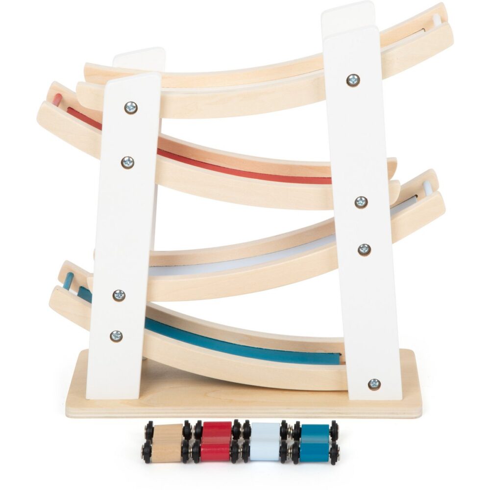 Op je plaatsen, maak je klaar, vertrek! Deze houten klik-klak-racebaan met een stabiele basis belooft snelle actie wanneer de vier kleine houten auto’s over de hellingen suizen. Tijdens hun reis van verdieping naar verdieping maken ze grappige salto’s en zorgen ze voor veel plezier. Wit gelakt en natuurlijk hout in combinatie met het klassieke kleurdesign van de hellingen maakt de baan tot een blikvanger die discreet in elke kinderkamer past. Bevordert zowel de motoriek als de oog-handcoördinatie en voorkomt verveling in de kinderkamer! Opgeborgen op de kinderkamerplank integreert de racebaan zich perfect in elk kamerdesign, want natuurlijk hout en wit gelakt hout domineren de look, zonder dat kinderen het tijdens het spelen moeten doen zonder kleurrijke racebanen.